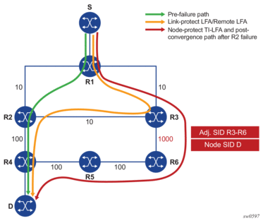 The SR OS supports the node-protect extensions to the TI-LFA algorithm as described in draft-bashandy-rtgwg-segment-routing-ti-lfa-05.