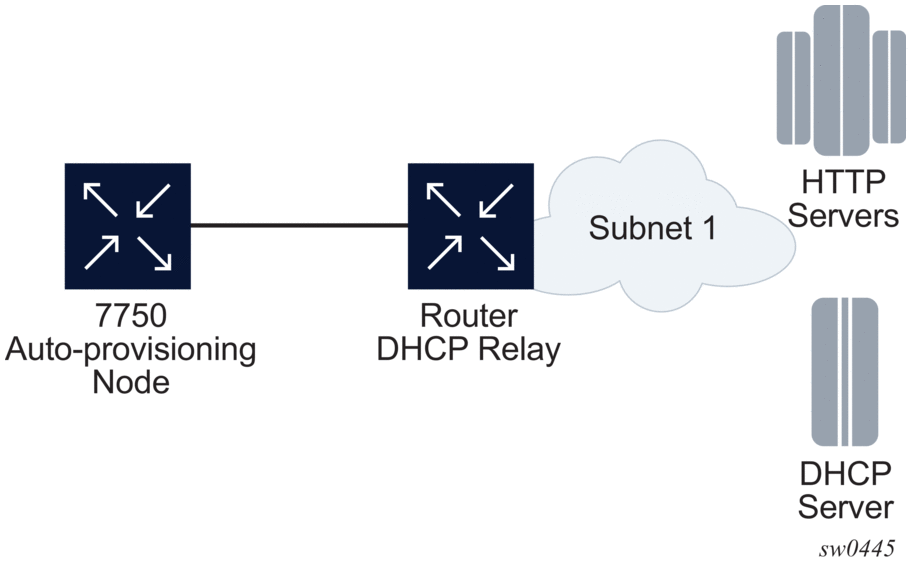 After the auto-provision application is triggered using a tools command, SR OS checks all operationally up ports without IP addresses and send DHCP discovery to these interfaces. The DHCP server needs to be configured with Option 67 and the user must provide the SR OS with the URL of a file server and the corresponding directory for the image.