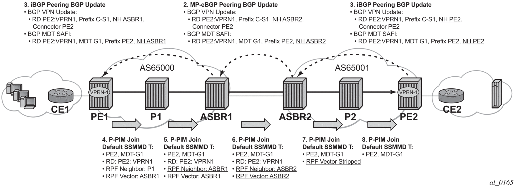 In case of Inter-AS MVPN Option B, routing information towards the source PE is not available in a remote AS domain, since IGP routes are not exchanged between ASes. Routers in an AS other than that of a source PE, have no routes available to reach the source PE and thus PIM JOINs would never be sent upstream. To enable setup of MDT towards a source PE, BGP next-hop (ASBR) information from that PE's MDT-SAFI advertisement is used to fake a route to the PE. If the BGP next-hop is a PIM neighbor, the PIM JOINs would be sent upstream. Otherwise, the PIM JOINs would be sent to the immediate IGP next-hop (P) to reach the BGP next-hop. Since the IGP next-hop does not have a route to source PE, the PIM JOIN would not be propagated forward unless it carried extra information contained in RPF Vector.
