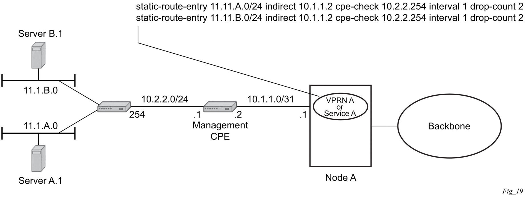 Static routes are used within many IES services and VPRN services. Unlike dynamic routing protocols, there is no way to change the state of routes based on availability information for the associated CPE. CPE connectivity check adds flexibility so that unavailable destinations will be removed from the VPRN routing tables dynamically and minimize wasted bandwidth. Figure 13 shows a setup with a directly connected IP target and Figure 14 shows a setup with multiple hops to an IP target.