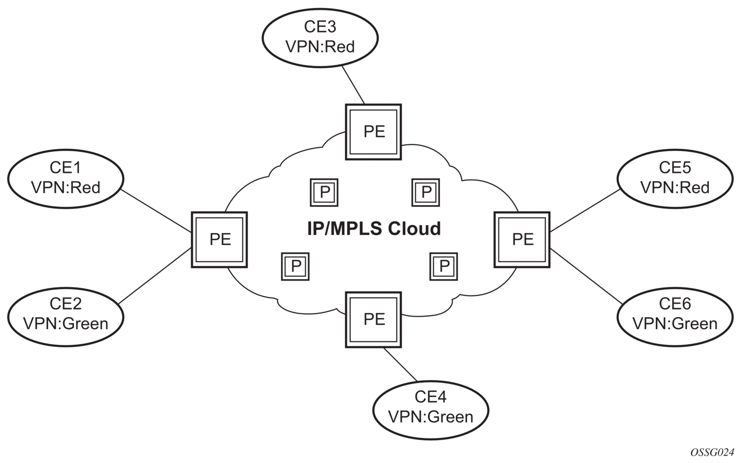 Before a customer data packet travels across the service provider's backbone, it is encapsulated with the MPLS label that corresponds, in the customer's VPN, to the route which best matches the packet's destination address. The MPLS packet is further encapsulated with one or additional MPLS labels or GRE tunnel header so that it gets tunneled across the backbone to the proper PE router. Each route exchanged by the MP-BGP protocol includes a route distinguisher (RD), which identifies the VPRN association. Thus the backbone core routers do not need to know the VPN routes. Figure 9 displays a VPRN network diagram example.