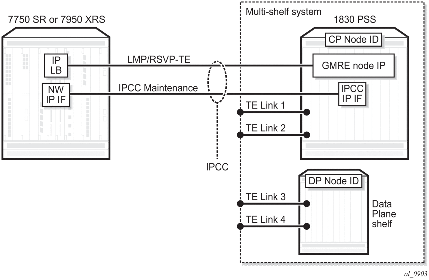 This section describes the various identifiers used on the 1830 PSS that are relevant to configuring the GMPLS UNI on the 7750 SR or 7950 XRS node in conjunction with the 1830 PSS. Figure 46 illustrates the identifier architecture of a 1830 PSS multi-shelf system. The multi-shelf system consists of a control plane node and one or more data plane nodes. The following identifiers are used: