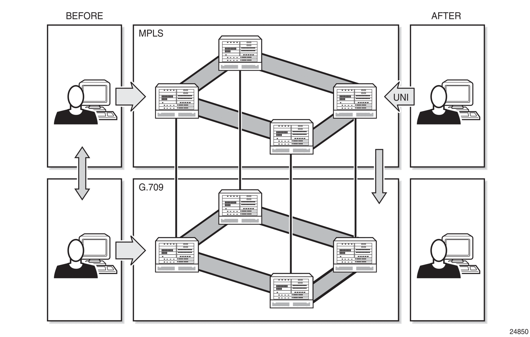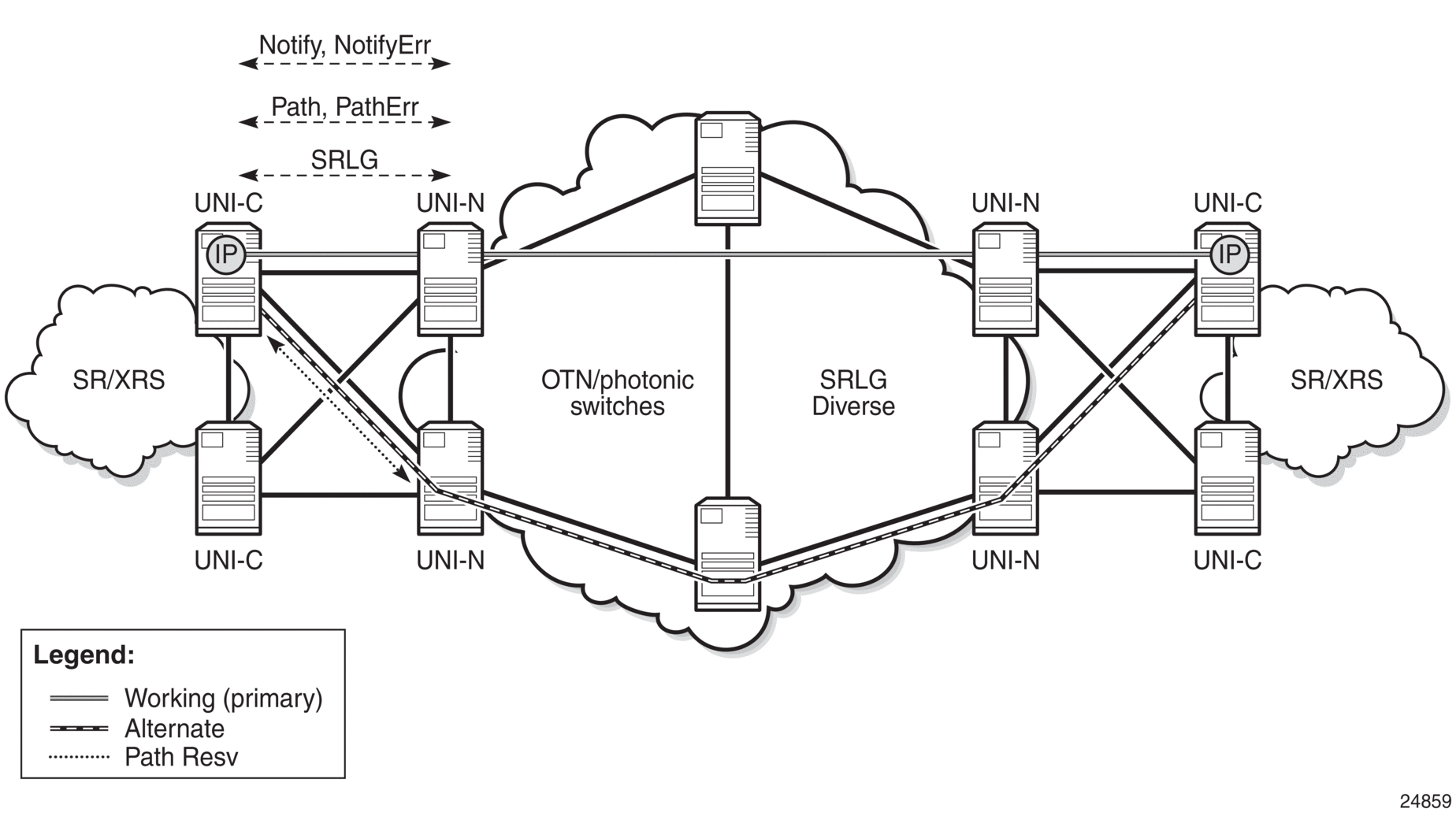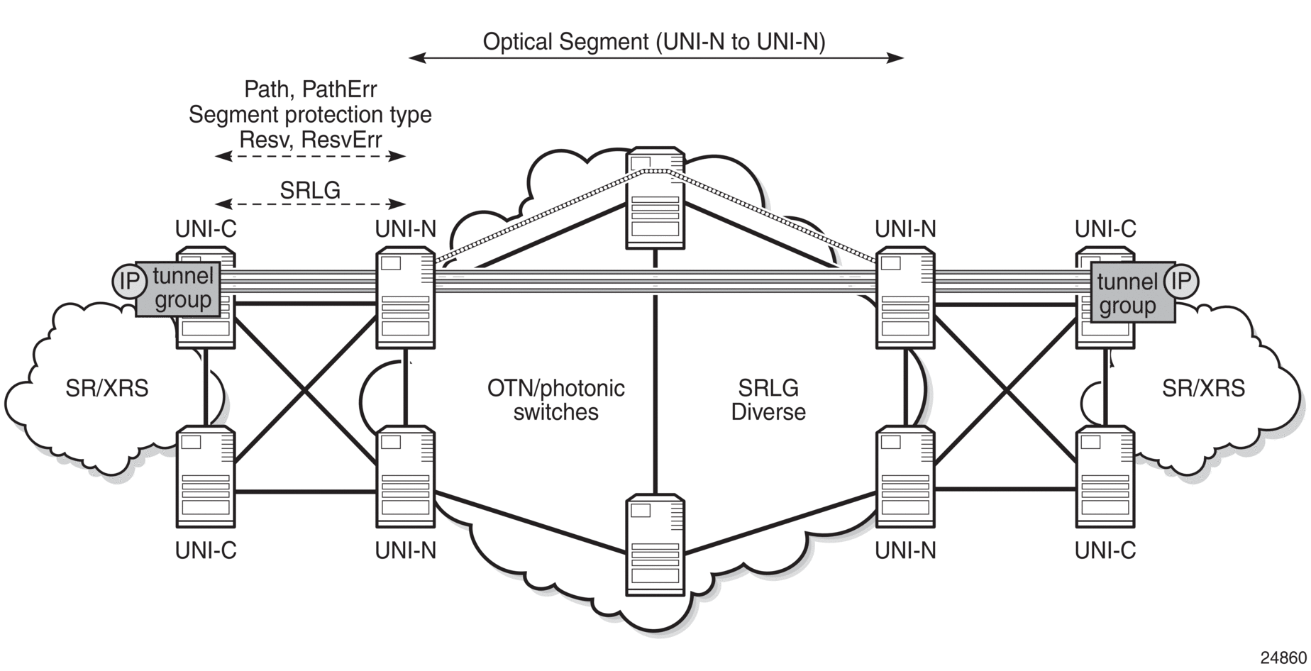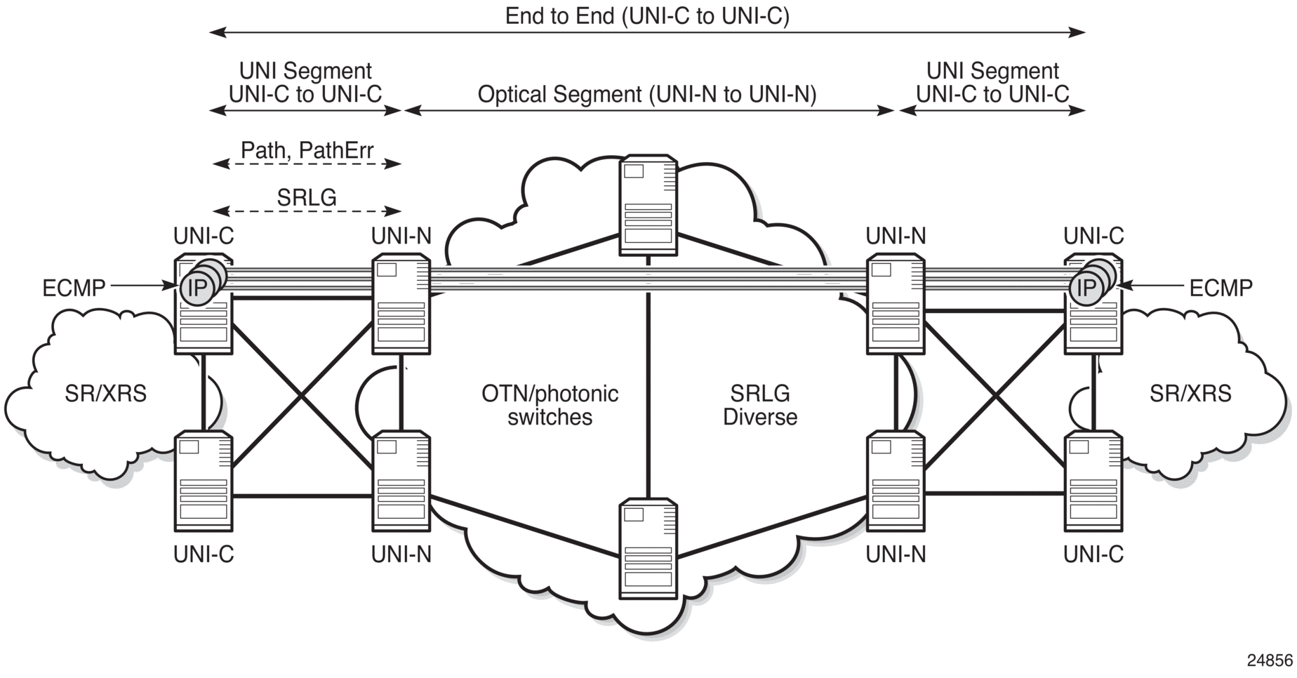 Figure 47 presents a generalized reference model in which the 7750 SR or 7950 XRS UNI-C nodes are dual-homed at the link layer to the 1830 PSS UNI-N nodes. Not all elements of this architecture may be required in all deployment cases.