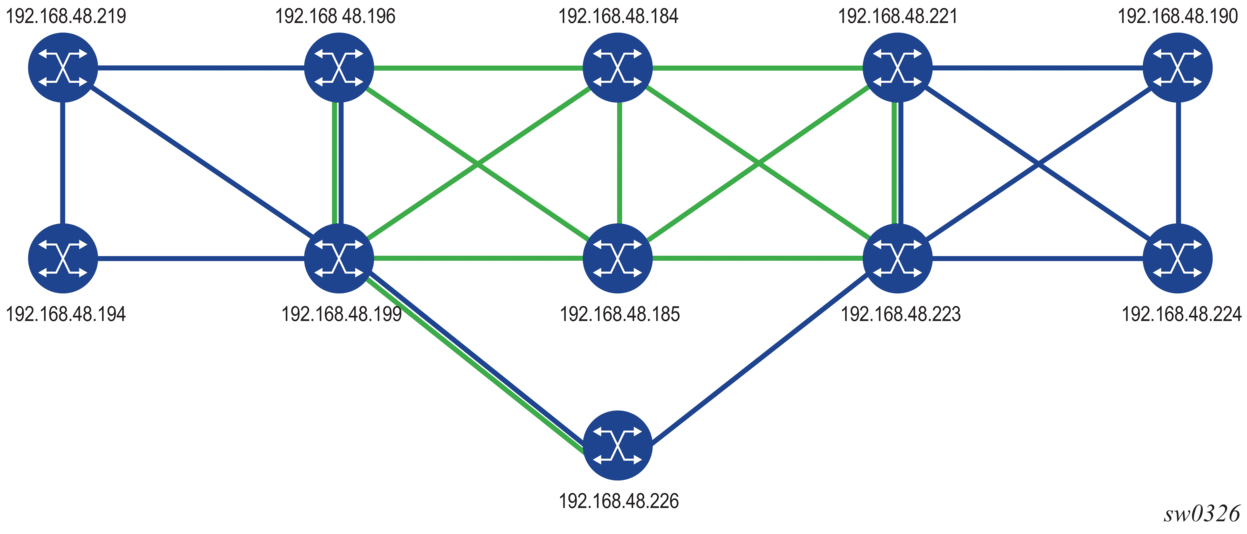 The following shows the detailed configuration for the creation of a mesh of SR-TE auto-LSPs. The network uses IS-IS with the backbone area being in Level 2 and the leaf areas being in Level 1.