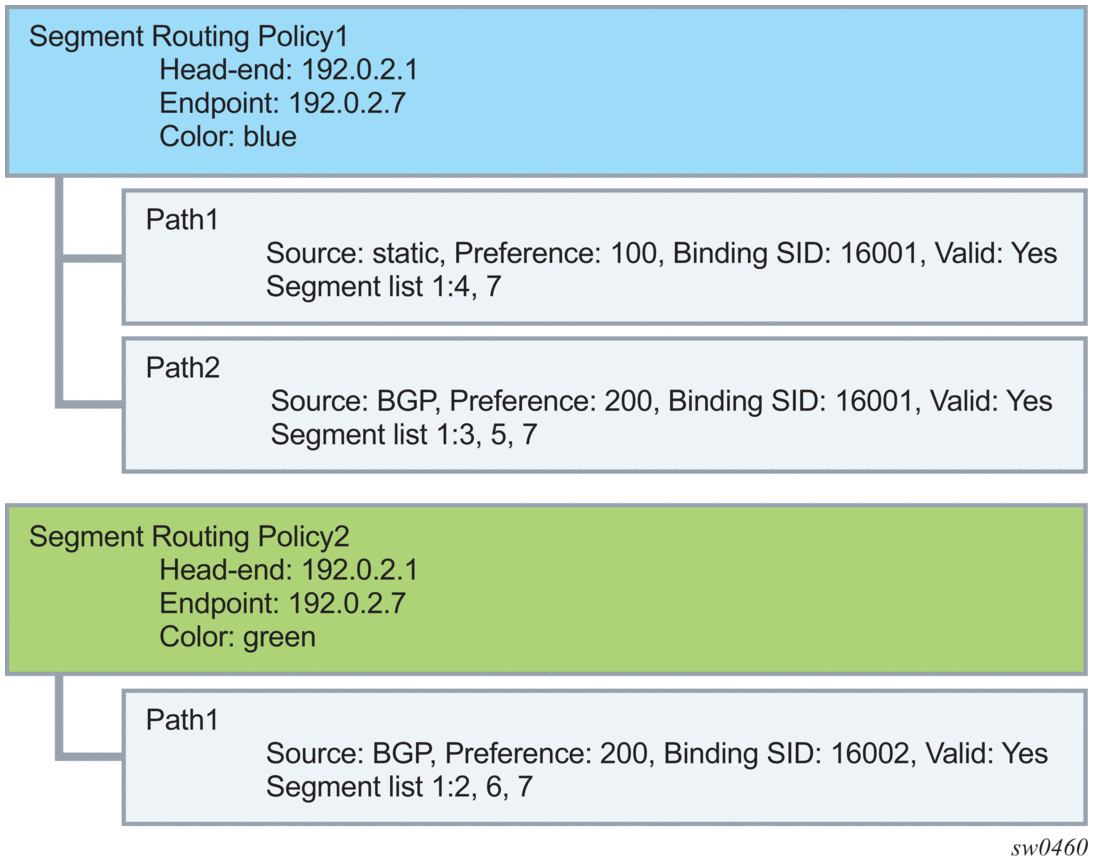 The two segment routing policies that are involved in this example and the associated relationships are depicted in