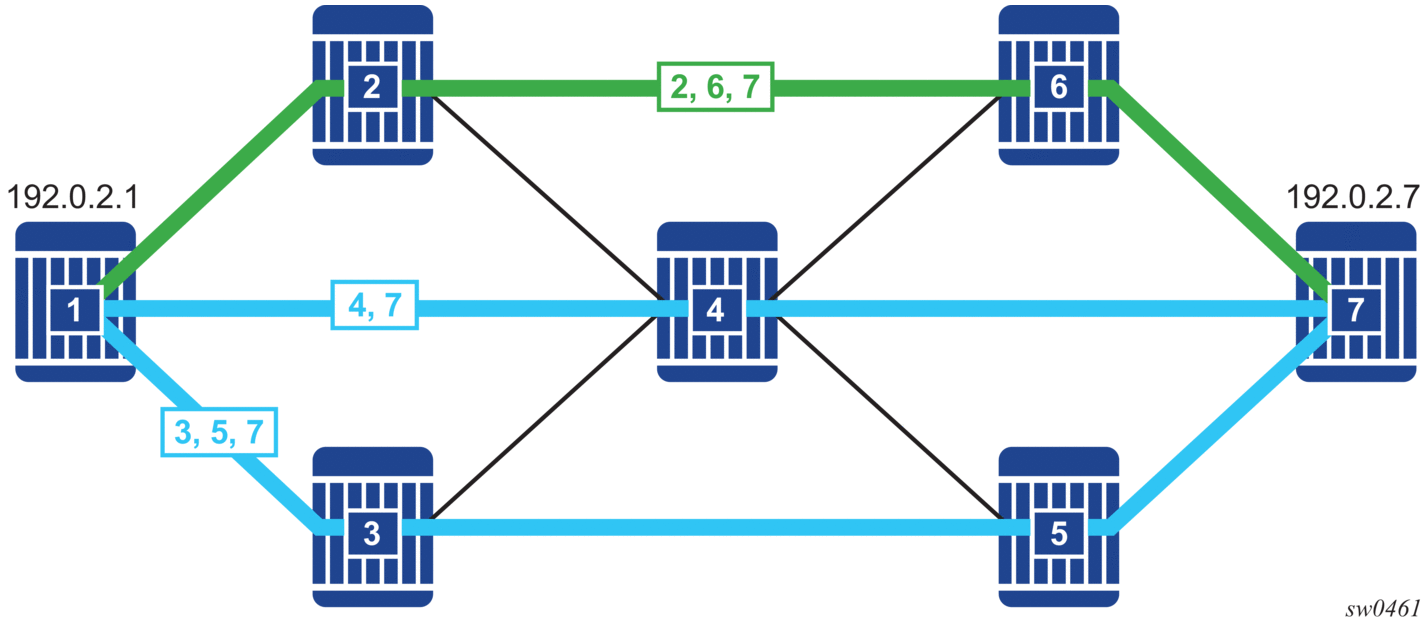 Figure 65 and there are two classes of traffic (blue and green) to be transported between node1 and node 7. There is a segment routing policy for the blue traffic between node1 and node7 and another segment routing policy for the green traffic between these same two nodes.