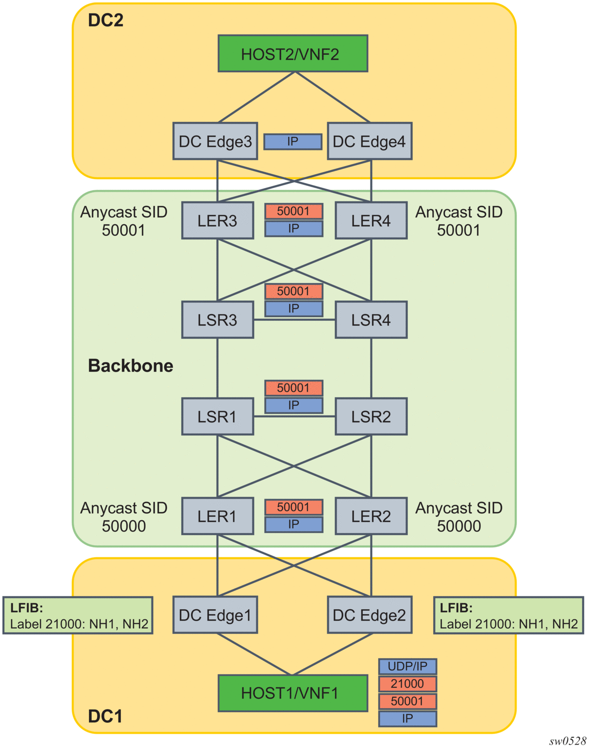Figure 57 illustrates the traffic forwarding from a Virtual Network Function (VNF1) residing in a host in a Data Center (DC1) to VNF2 residing in a host in DC2 over the segment routing capable backbone network. DC1 and DC2 do not support segment routing and MPLS while the DC Edge routers do not support segment routing. Hence, MPLS packets of VNF1 flows are tunneled over a UDP/IP or GRE/IP tunnel and a static label route is configured on DC Edge1/2 to steer the decapsulated packets to the remote DC Edge3/4.