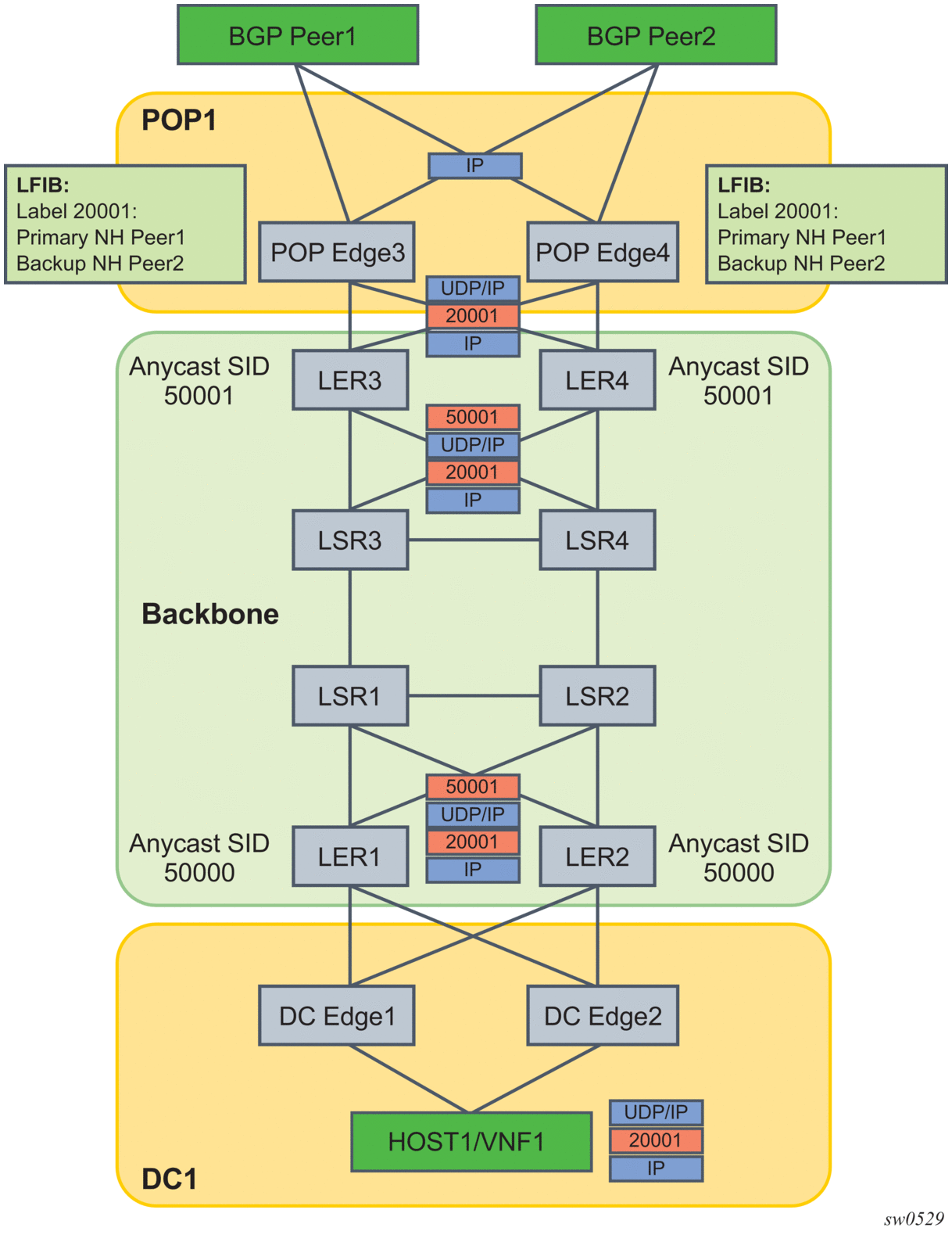 This label 20001 is configured on POP Edge3/4 using the MPLS forwarding policy feature with primary next-hop of Peer1 and backup next-hop of Peer2.