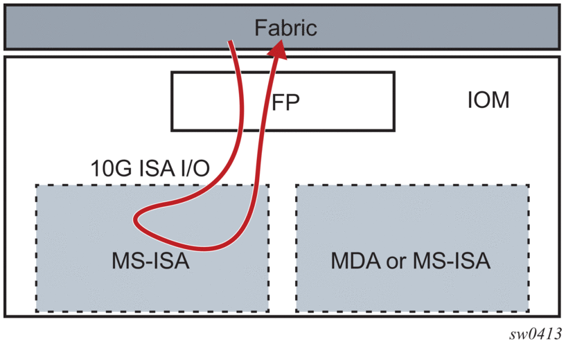 The MS-ISA fits in an MDA/ISA slot on an IOM and has no external ports, so all communication passes through the IOM, making use of the network processor complex on the host IOM for queuing and filtering functions like other MDAs and ISAs. See Figure 1.