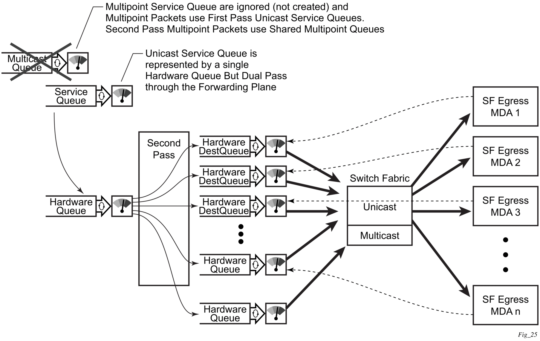 Functionally, multipoint shared queuing is a superset of shared queuing. With shared queuing on a SAP or SLA profile instance, only unicast packets are processed twice: once for the initial service-level queuing and a second time for switch fabric destination queuing. Shared queuing does not affect multipoint packet handling. Multipoint packet handling in normal (service queuing) is the same as shared queuing. When multipoint shared queuing is enabled, shared queuing for unicast packets is automatically enabled.