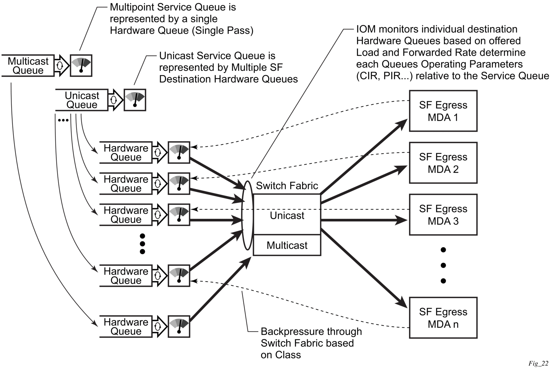 Normal or service queuing is the default mode of operation for SAP ingress queuing. Service queuing preserves ingress forwarding bandwidth by allowing a service queue defined in an ingress SAP QoS policy to be represented by a group of hardware queues. A hardware queue is created for each switch fabric destination to which the logical service queue must forward packets. For a VPLS SAP with two ingress unicast service queues, two hardware queues are used for each destination forwarding engine the VPLS SAP is forwarding to. If three switch fabric destinations are involved, six queues are allocated (2 unicast service queues multiplied by 3 destination forwarding complexes equals six hardware queues). Figure 35 shows unicast hardware queue expansion. Service multipoint queues in the ingress SAP QoS policy are not expanded to multiple hardware queues, each service multipoint queue defined on the SAP equates to a single hardware queue to the switch fabric.