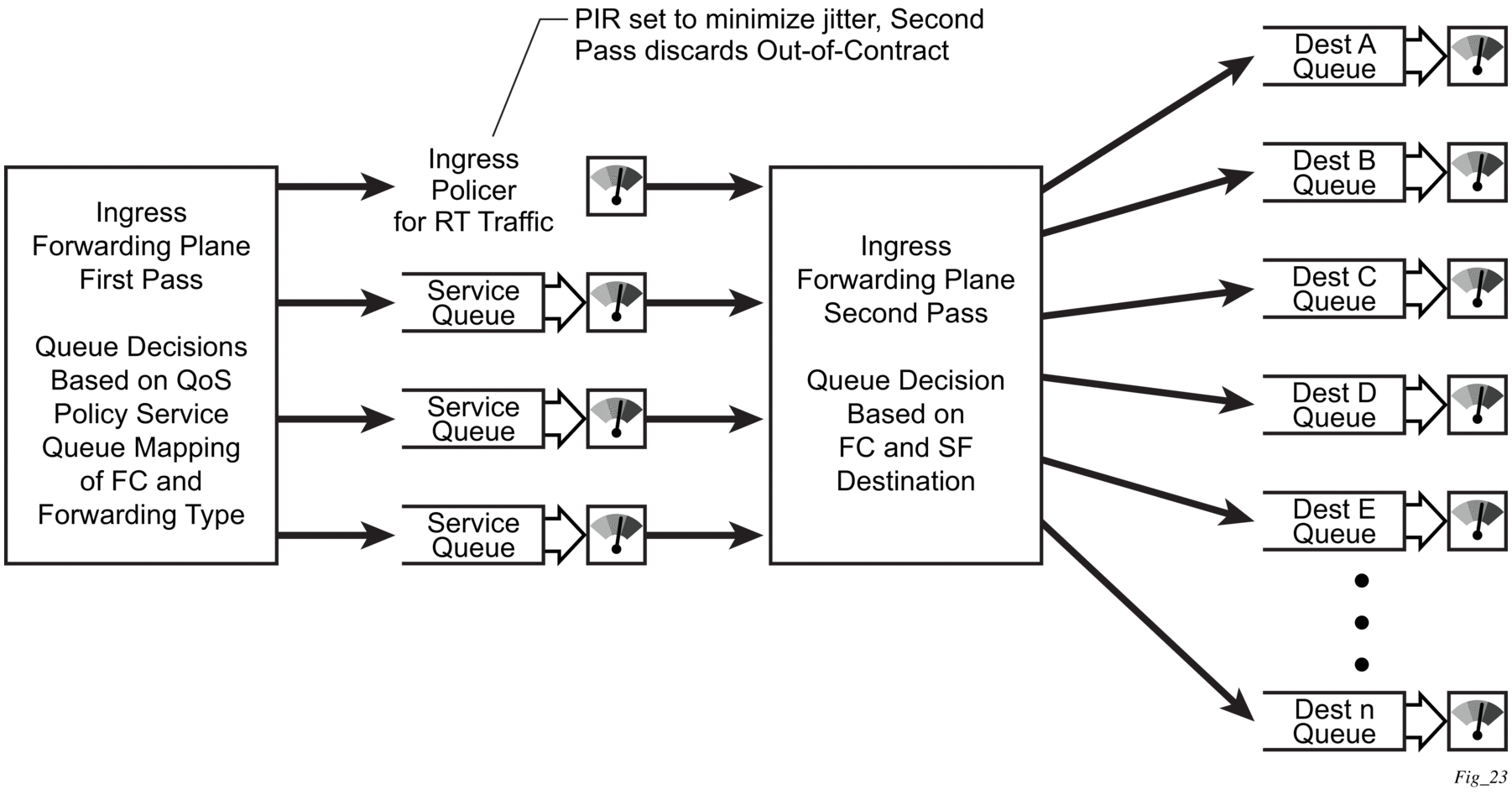 To avoid the hardware queue expansion issues associated with normal service-based queuing, the system allows an ingress logical service queue to map to a single hardware queue when shared queuing is enabled. Shared queuing uses two passes through the ingress forwarding plane to separate ingress per service queuing from the destination switch fabric queuing. In the case of shared queuing, ingress unicast service queues are created one-for-one relative to hardware queues. Each hardware queue representing a service queue is mapped to a special destination in the traffic manager that ‘forwards’ the packet back to the ingress forwarding plane, allowing a second pass through the traffic manager. In the second pass, the packet is placed into a ‘shared’ queue for the destination forwarding plane. The shared queues are used by all services configured for shared queuing.