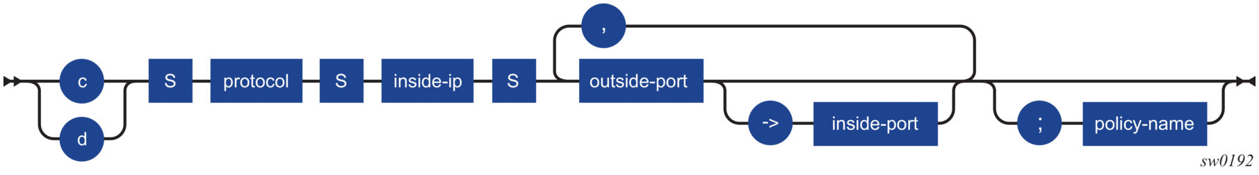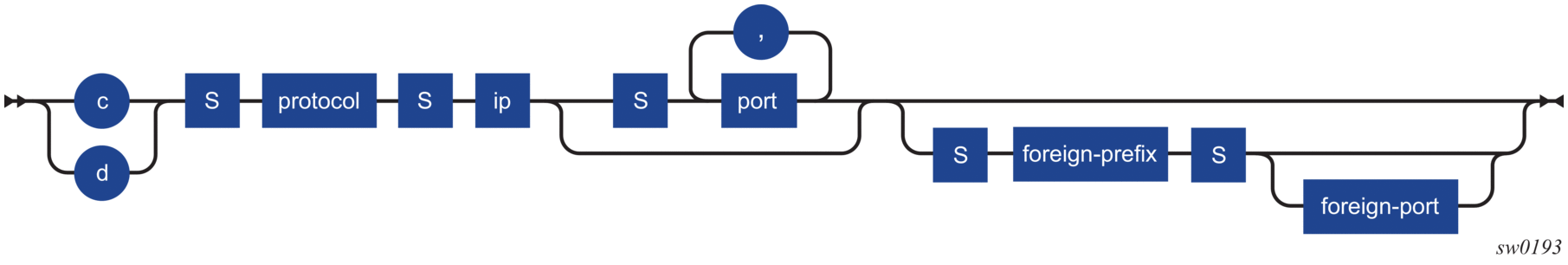 26.6527.28 | Alc-Int-Dest-Id-Str | A string representing an aggregation point (example, Access Node) and interpreted as the intermediate destination ID. Subscribers connected to the same aggregation point receives the same int-dest-id string assigned. The int-dest-id is used in MC ring access redundancy to identify subscribers behind a ring node (configure redundancy multi-chassis peer ip-address mc-ring ring/l3-ring name ring-node ring-node-name). The int-dest-id can be used in QoS to shape the egress traffic of a group of subscribers to an aggregate rate using Vports (configure port port-id ethernet access egress vport name host-match dest destination-string) or secondary shapers on HS-MDAv2 (configure port port-id ethernet egress exp-secondary-shaper secondary-shaper-name). For egress policed subscriber traffic, the int-dest-id can be used to select the egress queue-group for forwarding (configure port port-id ethernet access egress queue-group name host-match dest destination-string). Strings longer than the allowed maximum are treated as setup failures. |