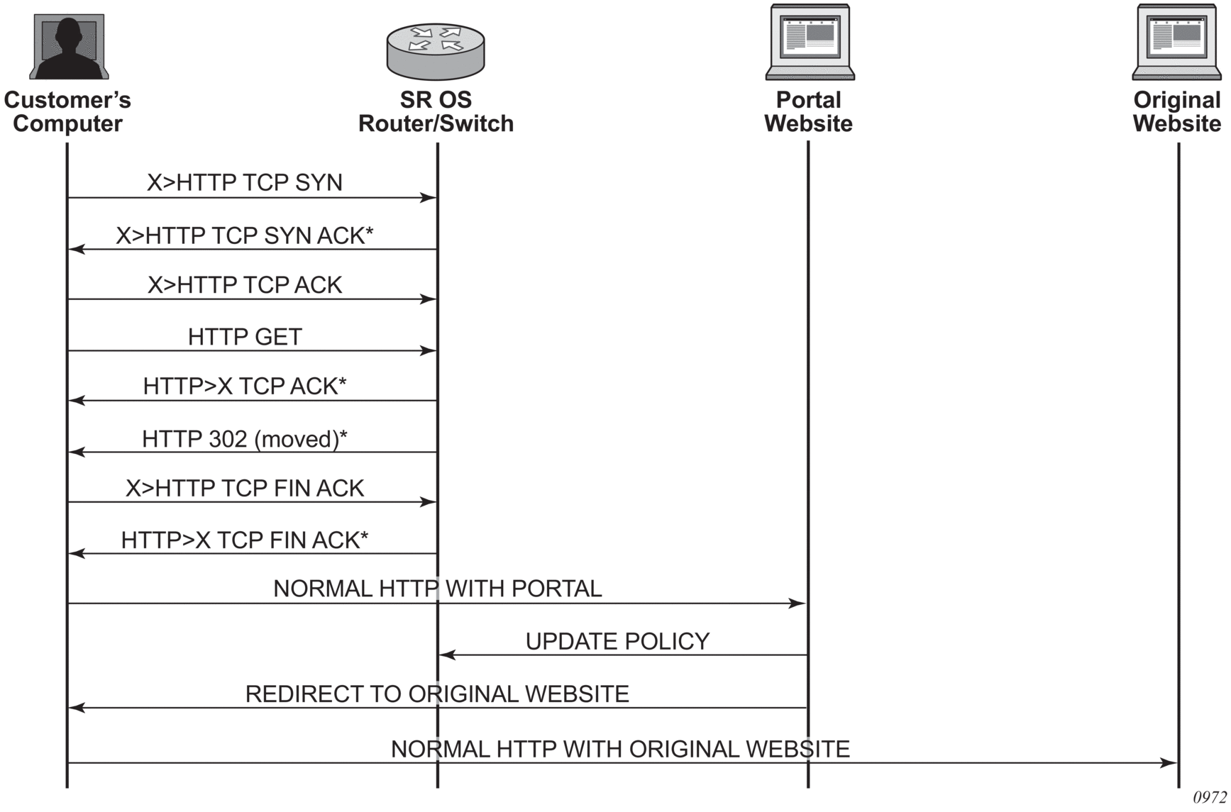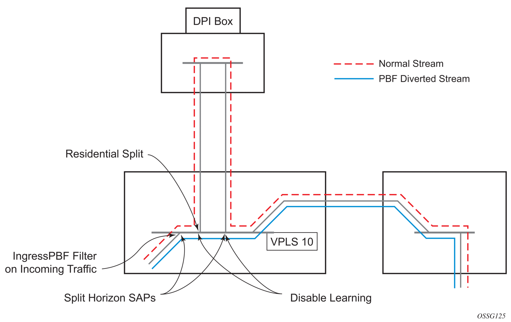 DPI performs packet inspection/modification and either drops the traffic or forwards the traffic back into the box through SAP 1/1/21:1. Traffic will then be sent to spoke-sdp 3:5.