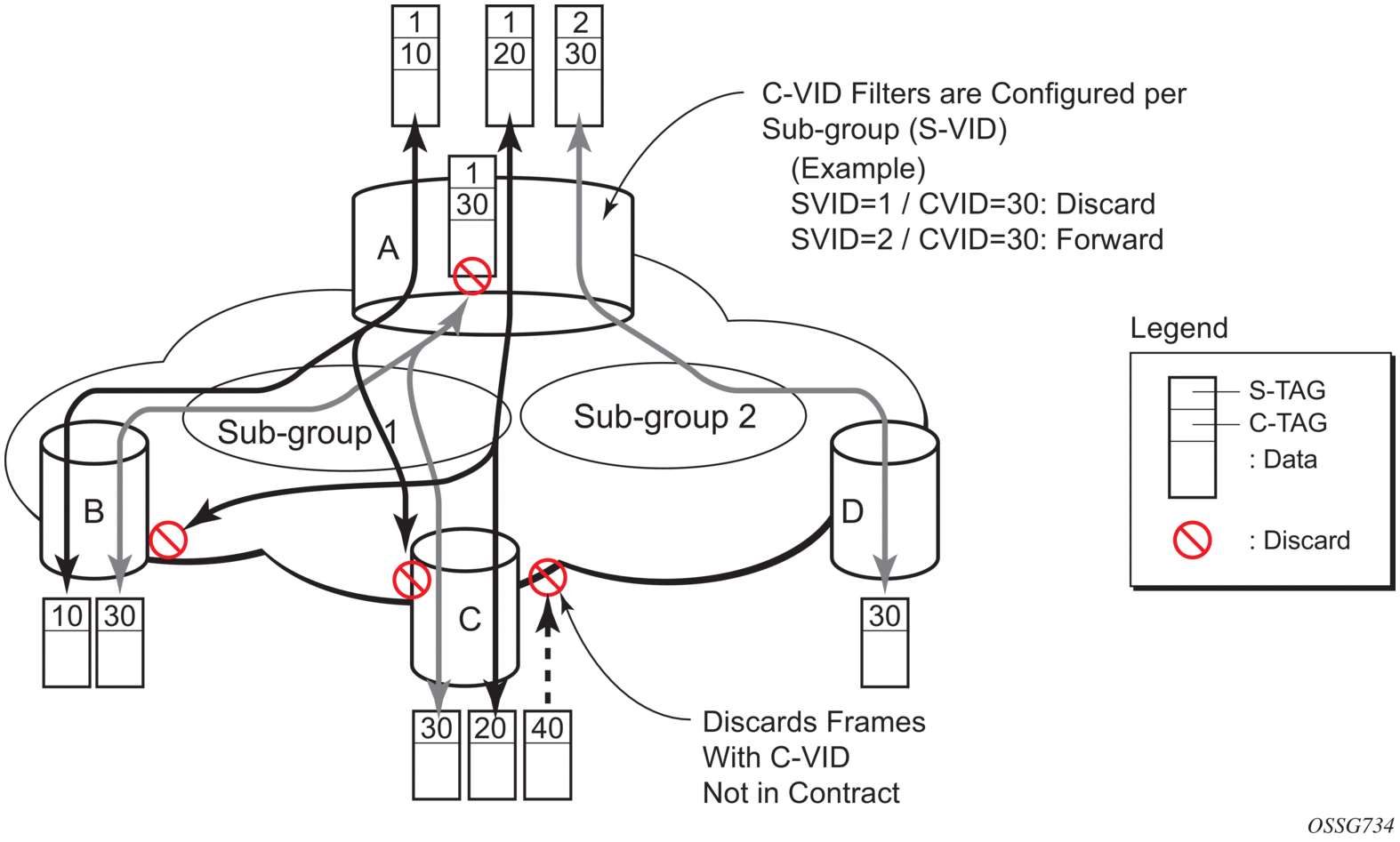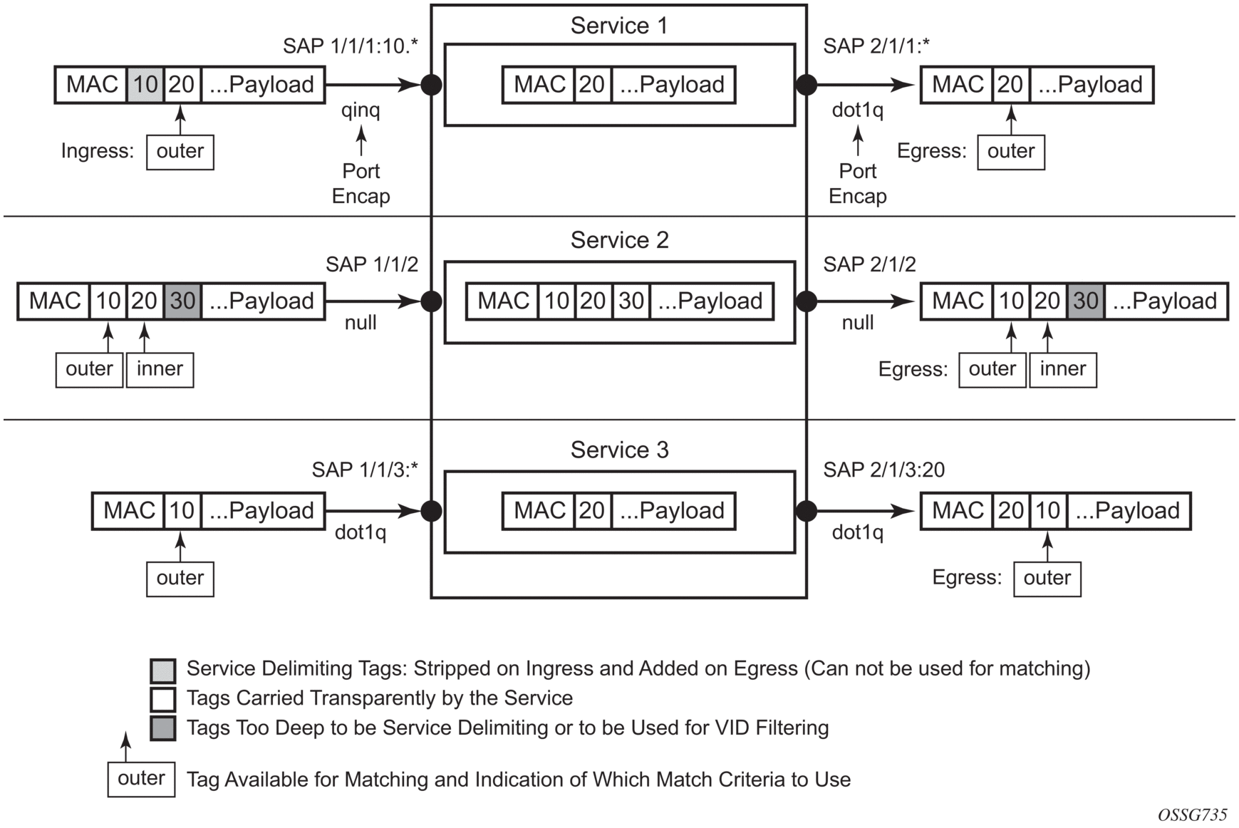inner-tag/outer-tag — The filter searches to match Ethernet frames with the non-service delimiting tags, as described in the