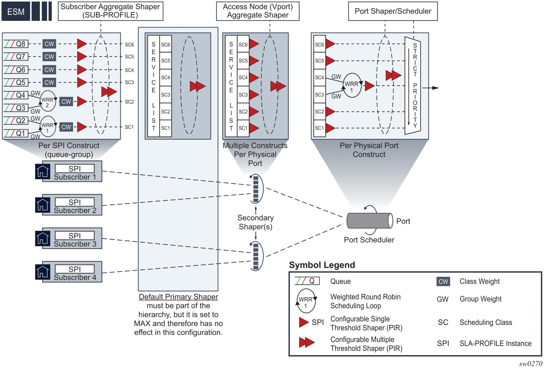 Subscriber queues on HSQ in the ESM context are always allocated in a set of eight queues per SLA profile instance (SPI). SPI has a particularly important role on HSQ that will determine not only the scale of subscribers but also the subscriber’s QoS modes as it pertains to shaping hierarchy. At this point it suffices to say that SPI is an instantiation of SLA profile and each subscriber host or a PPPoE or IPoE session must be associated with an SPI. An SLA-profile, with its reference to a QoS policy, indirectly defines queuing configuration along with classification for the subscriber host or session. Multiple subscriber hosts or sessions can share the same SPI. The number of SPIs per subscriber determines the SLA profile mode in which ESM on HSQ operates.