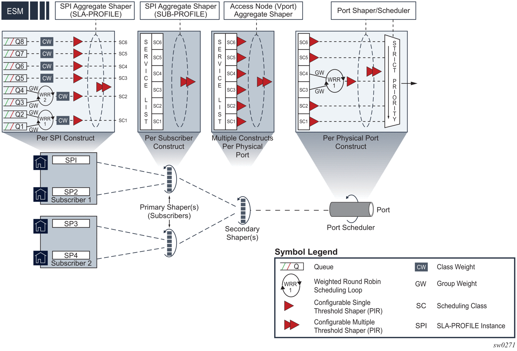 This section discusses High Scale QoS (HSQ) IOM as it applies to ESM. HSQ IOM features a high scale egress traffic manager with an expansive set of QoS capabilities that are particularly suitable for ESM applications. Refer to the 7450 ESS, 7750 SR, 7950 XRS, and VSR Quality of Service Guide for detailed information about HSQ.