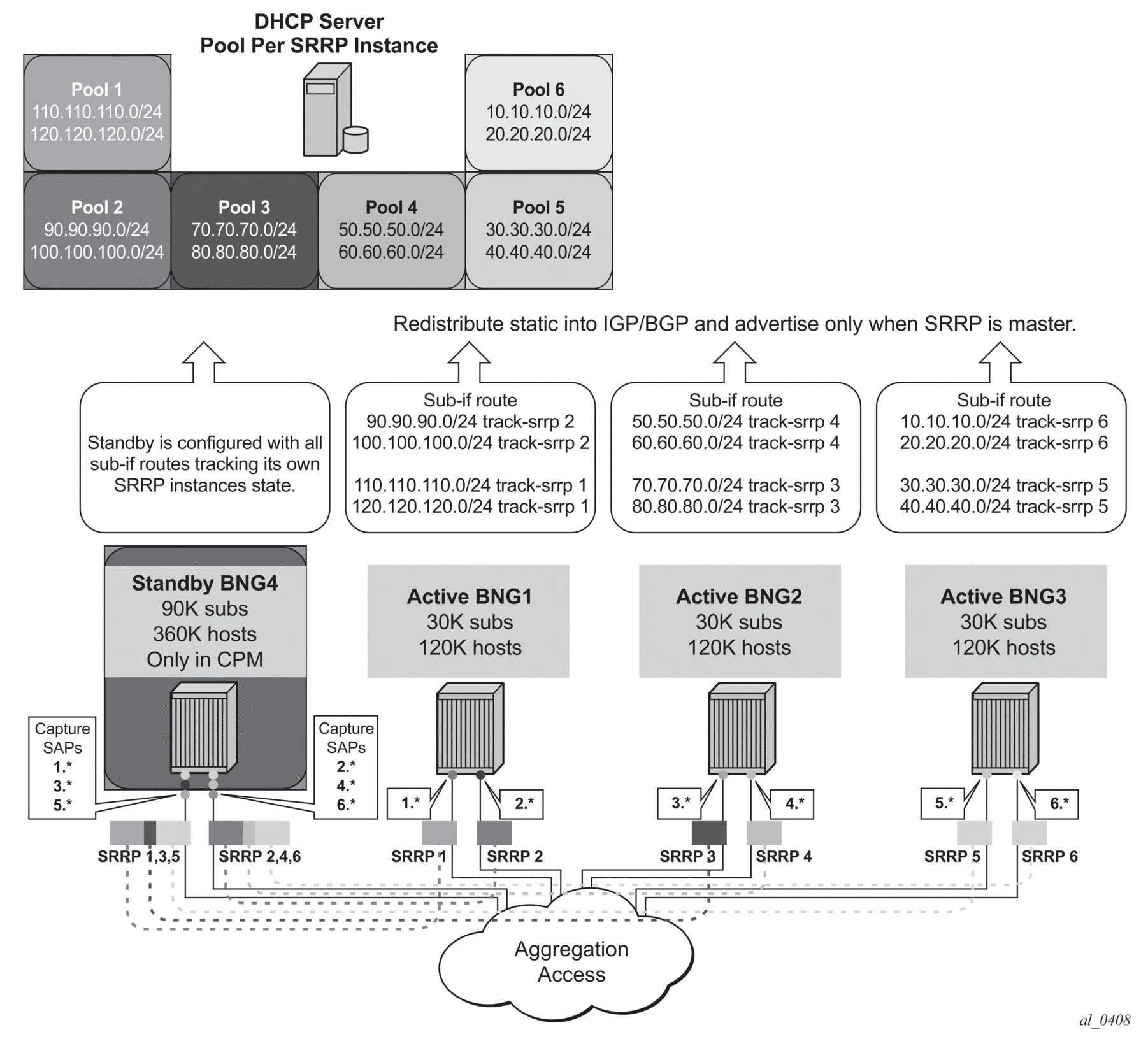 A deployment case that is not supported is the one where subnets spawn (are aggregated) over multiple group-interfaces (SRRP instances) and at the same time /32s are not allowed to be advertised from the protecting node. This scenario would require redundant interface support while subscriber-hosts are not necessarily instantiated in the protecting node.