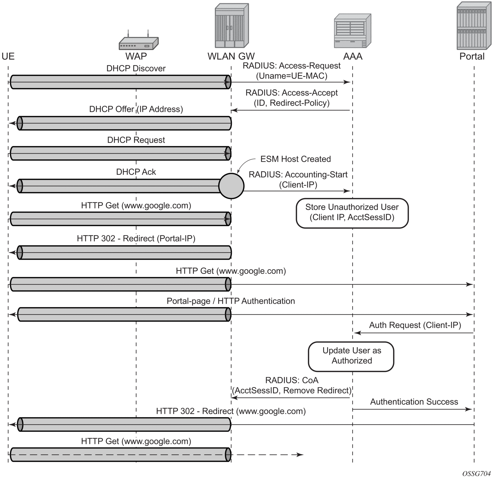 7750 WLAN-GW uses existing http-redirect action in IP filter to trigger redirect port-80 traffic. In case of open SSID, on receiving DHCP DISCOVER, MAC based authentication is performed with the RADIUS server as per configured authentication policy. The SLA-profile returned from RADIUS server in authentication-accept (or the default SLA-profile) contains the filter with http-redirect. Redirect via HTTP 302 message to the UE is triggered from the CPM. Once the user posts its credentials, RADIUS server generates a CoA-request message removing the http-redirect by specifying an SLA-profile without redirect action. If the portal authentication fails, the RADIUS server generates a disconnect-request message to remove the ESM host. In case of wlan-gw tunnel from the AP, the DHCP messages and data are both tunneled to the WLAN-GW. See Figure 168.