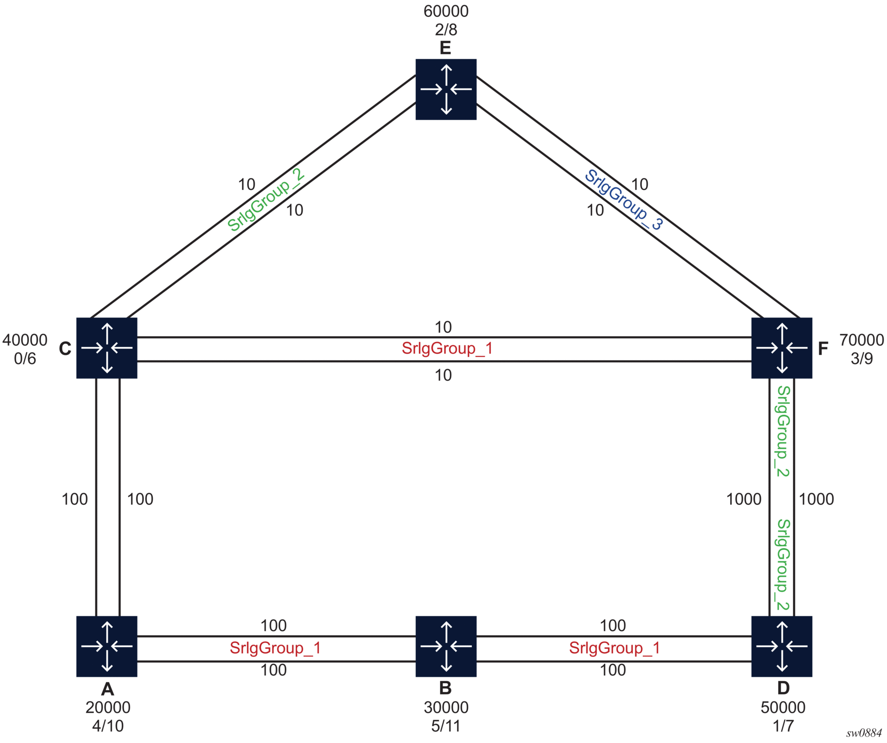 Figure 13 shows a sample network topology that uses the OSPF routing protocol and in which the user assigns an SRLG ID to each group of OSPF links to represent fate-sharing among the links in the group. Assume the router ecmp value is set to 1.
