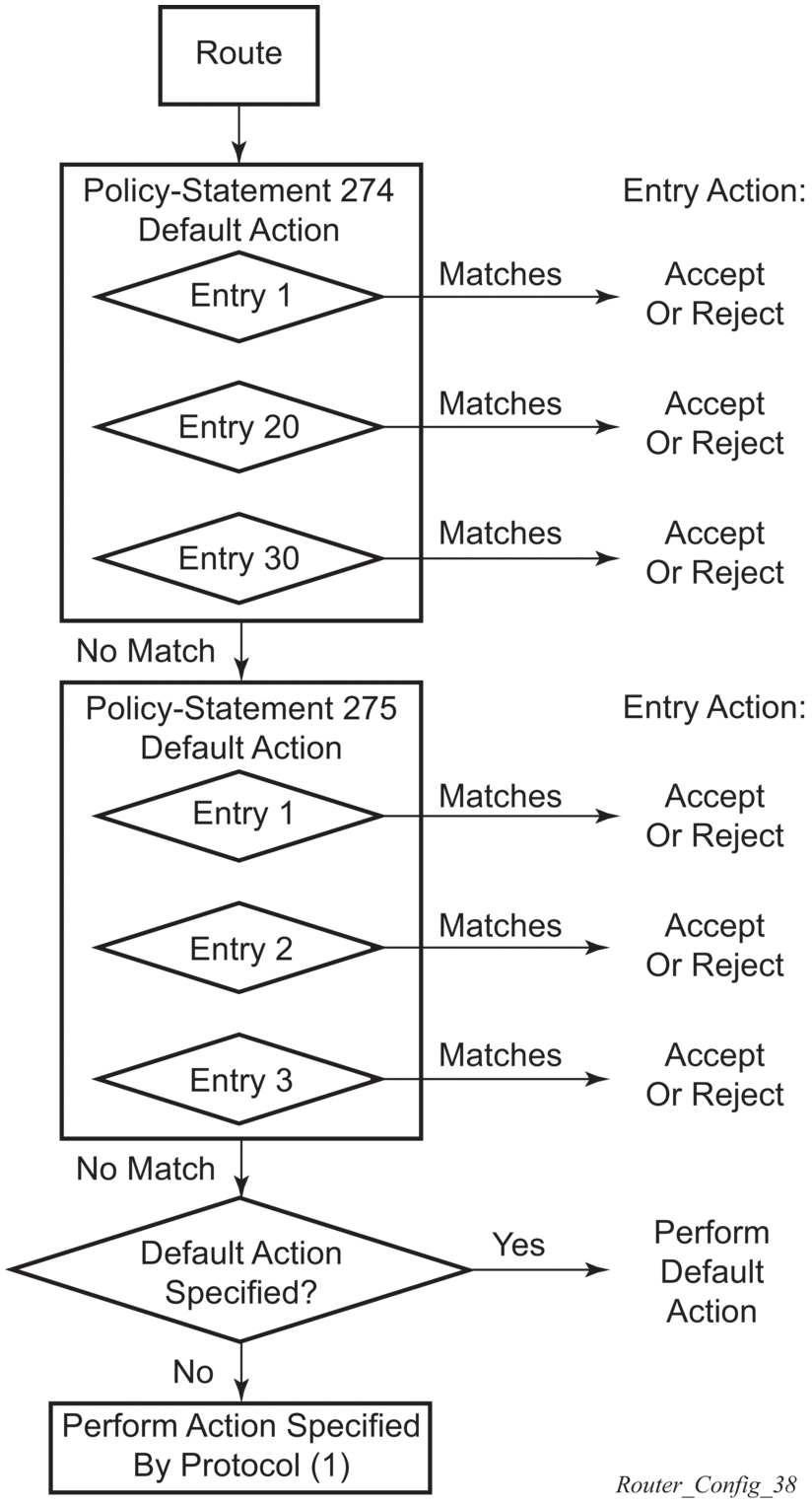 Routing policy statements can consist of as few as one or several entries. The entries specify the matching criteria. A route is compared to the first entry in the policy statement. If it matches, the specified entry action is taken, either accepted or rejected. If the action is to accept or reject the route, that action is taken and the evaluation of the route ends.
