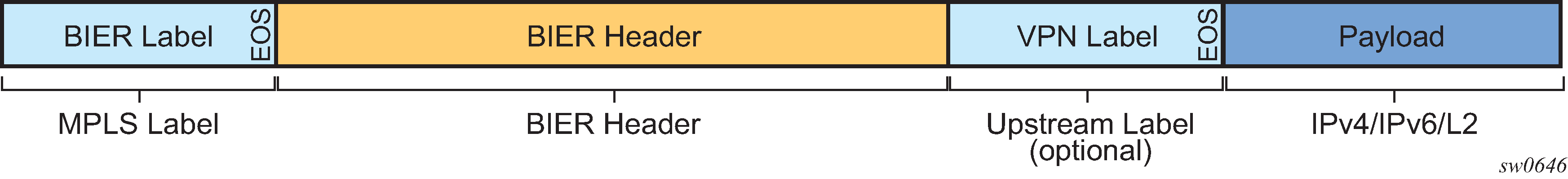 The original packet has a VC label identifying the VRF added first, then the packet (MPLS payload) is forwarded using BIER PMSI by adding a BIER header identifying the BFERs and BIER label learned using IGP from the next-hop router, as described in BIER forwarding. Finally, when the packet arrives on the BFER, the BIER label is stripped, the BIFT is used to identify whether the packet needs to be handled by a corresponding VRF (because the bit in the header corresponds to the BFER BFR-ID). The BFER strips the BIER header, uses the VC label to identify the VRF instance, strips the VC label, and forwards the packet according to the legacy multicast protocols configured on the SAPs of the MVPN (for example, PIM, IGMP, and MLD OIFs).