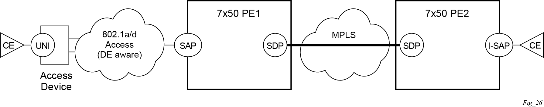 Figure 1 shows an example of a topology where the new DE feature may be used: a DE aware, 802.1ad access network connected via a regular SAP to a router PE.