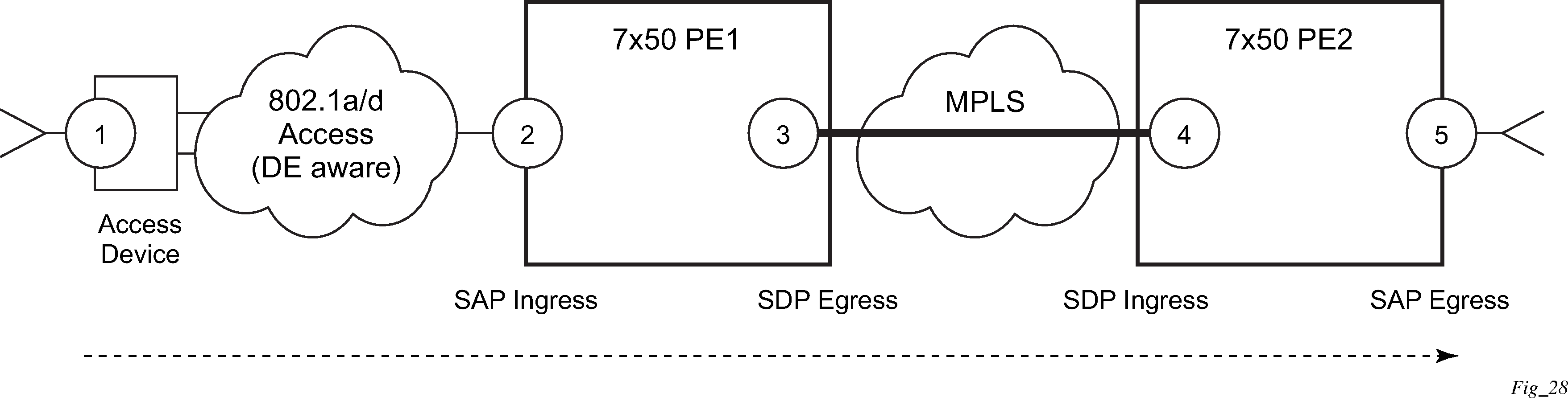 In the following example, PE1 can ensure coherent processing of the DE indication between the 802.1ad and the MPLS networks. For example, for packets ingressing the SAP connected to 802.1ad access, read the DE indication and perform classification, color aware metering/policing, marking of the related backbone QoS fields, and selective discarding of the frames throughout the queueing system, based on their discard eligibility. In addition, packets egressing the SAP toward the 802.1ad access provide correct DE indication by marking the new DE bit in the S-TAG.