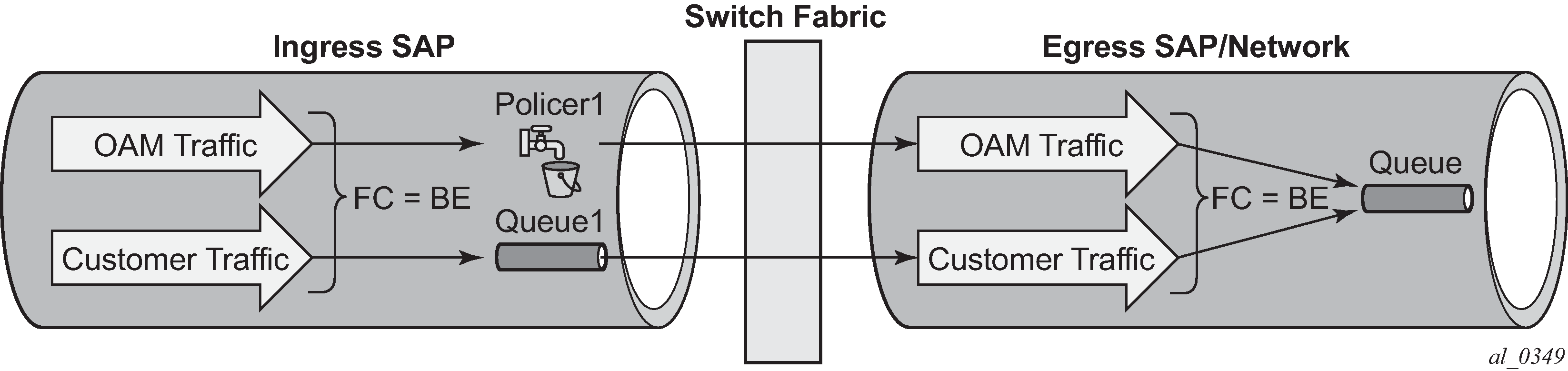 This could be used, for example, when it is required that ingress OAM traffic is not subject to the same QoS control as other customer traffic on a specific SAP. The OAM traffic could be classified based on its source MAC address (for example, with an OUI of 00-xx-yy as shown in Figure 1) and directed to policer 1 while the remainder of the customer’s traffic is processed using ingress queue 1.