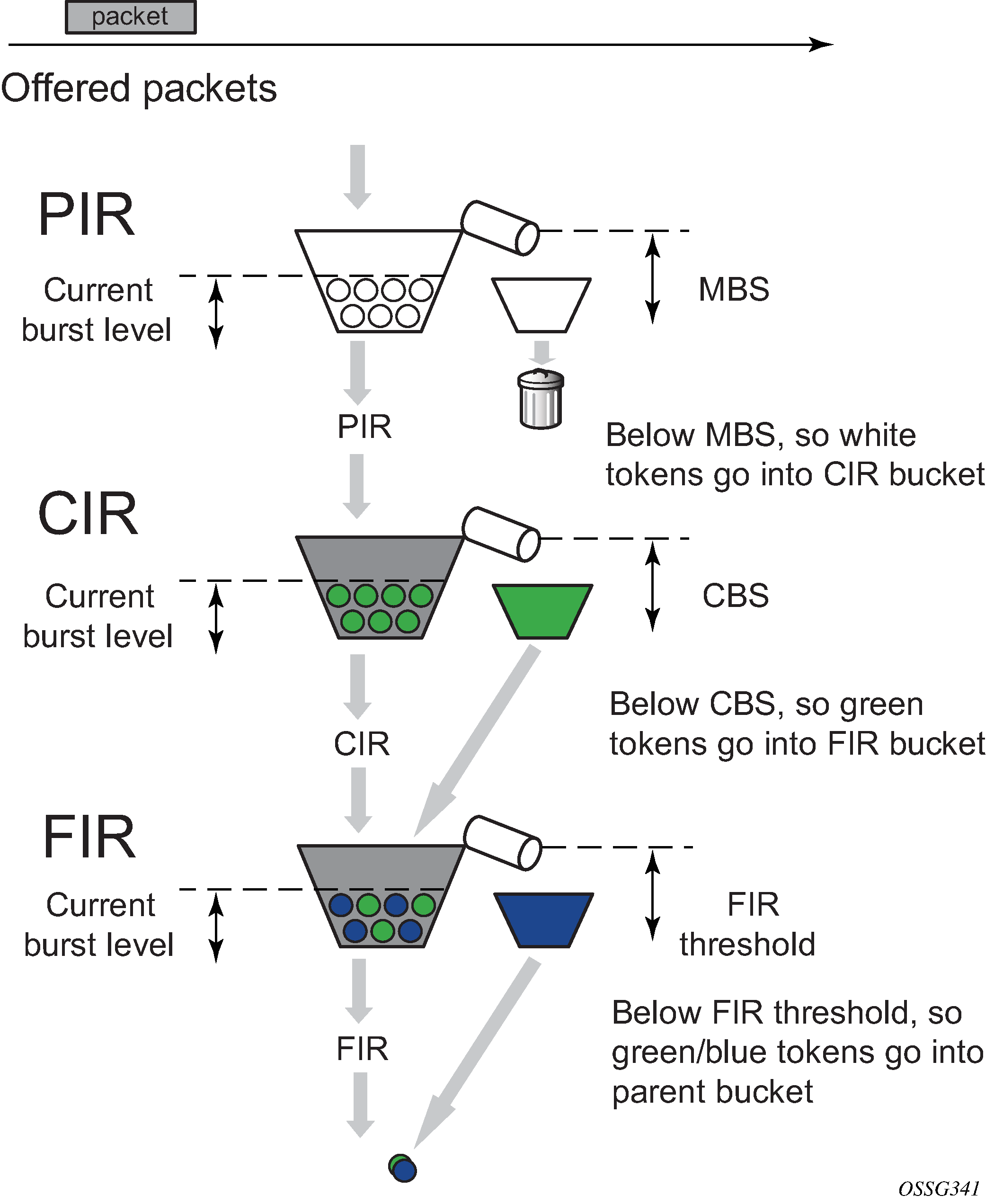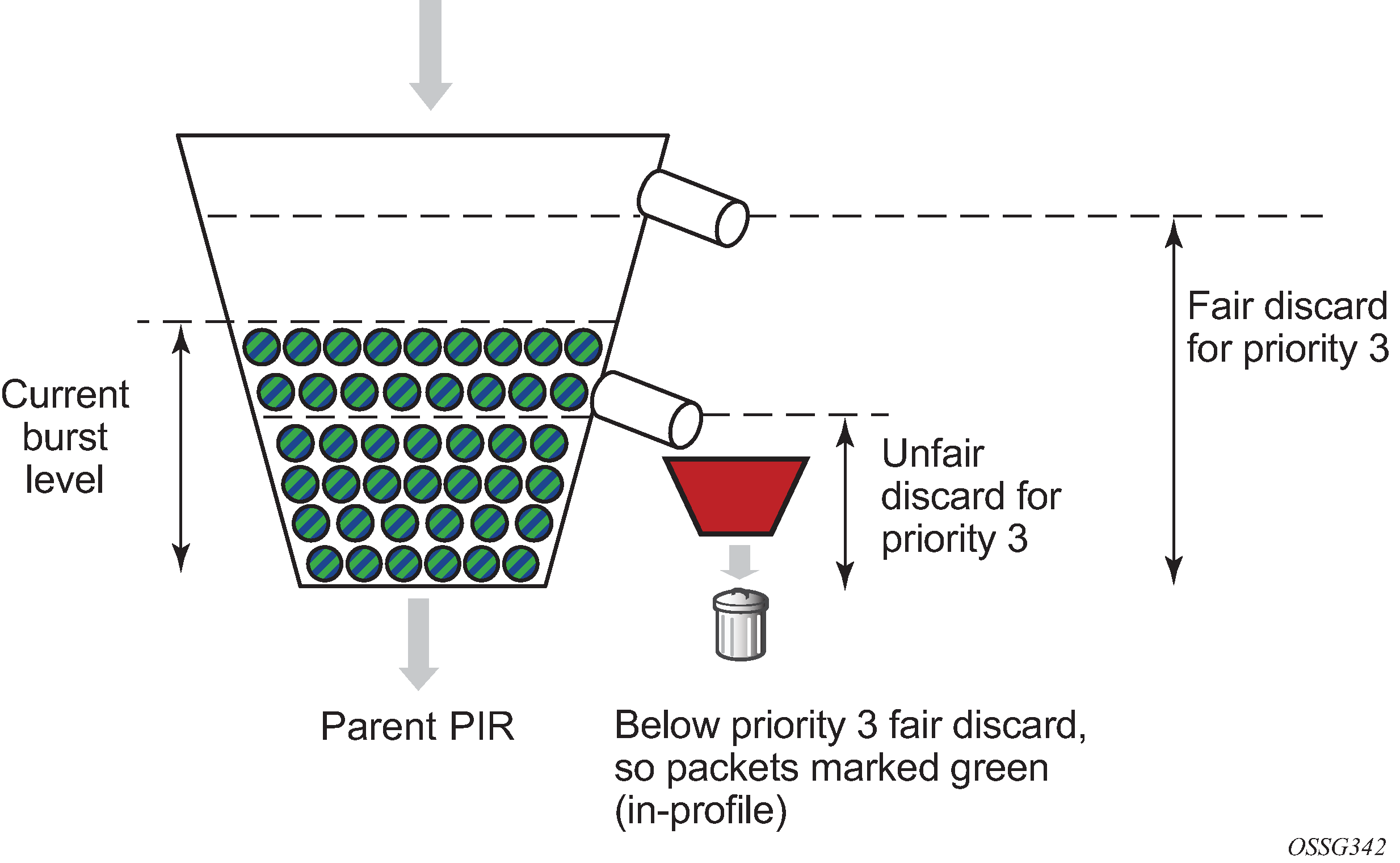 A second ‟discard-all” threshold is used to discard all remaining packets associated with the priority level in the case where higher priority traffic exists and the sum of both the priority level’s traffic and the higher priority traffic exceeds the parent policer rate. This protects the higher priority traffic on the parent policer from being discarded because of lower priority traffic. The child and parent policers operate in an atomic fashion, any conformance effect on a child policer's bucket depth is canceled when the parent policer discards a packet. Policer bucket rate and packet flow interaction with bucket depth are shown in Figure 1. Parent policer bucket and priority thresholds are shown in Figure 2.