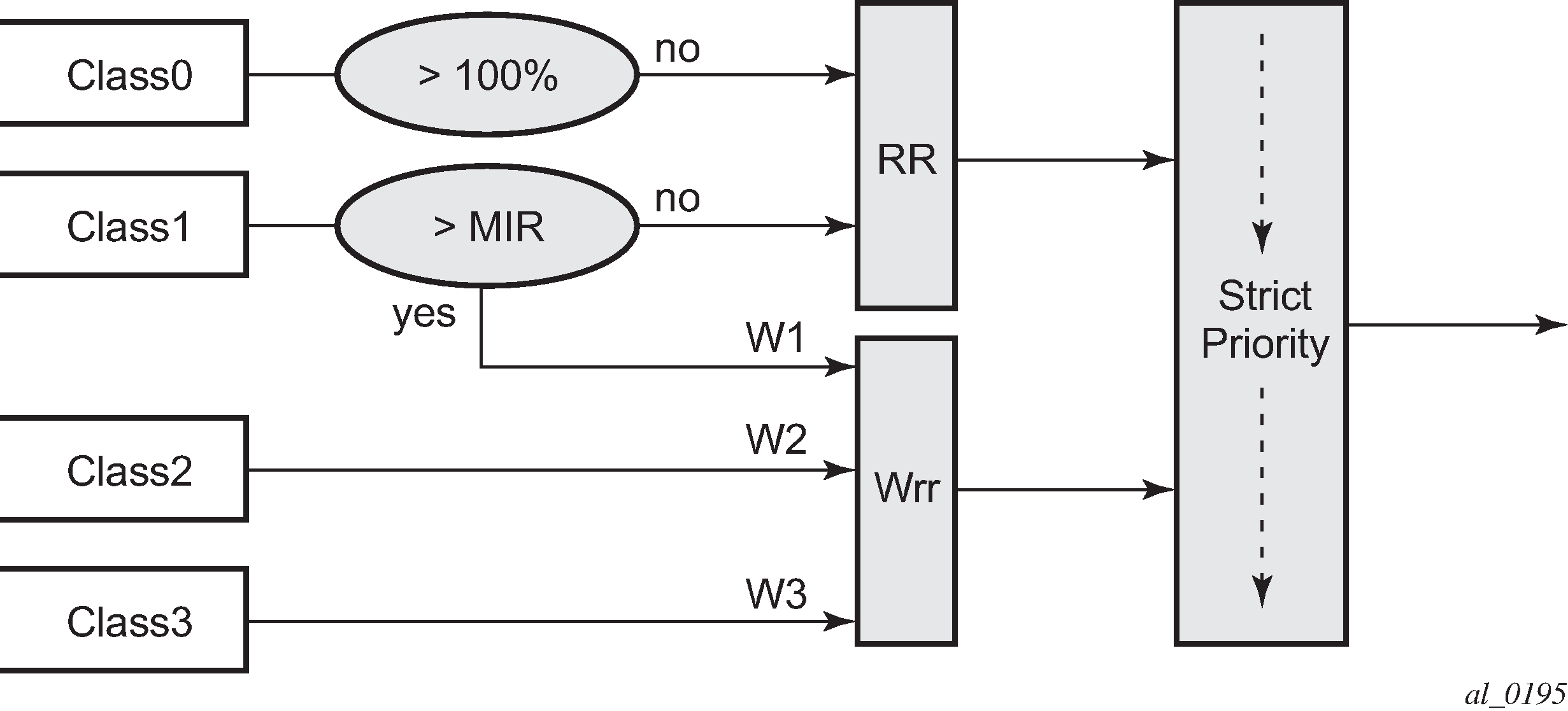 The minimum information rate, referred to as MIR in Figure 2 and MIR in CLI, applies to Class 1 queues only. The MIR parameter value is entered as a percentage of the available bundle rate. The WRR weight, referred to as W1, W2, and W3 in Table 2 and weight in CLI, applies to class 1, class 2, and class 3 queues. W1 is not configurable and is internally set to a value of 1 such that Class 1 queue shares 1% of the available bundle rate when the sum of W1, W2, and W3 equals 100. W2 and W3 weights are integer values and are user configurable such that Class 2 queue shares W2/(W1+W2+W3) and Class 3 queue shares W3/(W1+W2+W3) of the available bundle rate.