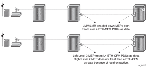 Both variants can be configured together on supported connections and within their supported services. Figure 62 shows the logical processing chain and interaction using an ingress QinQ SAP in the form VID.* and various ingress ETH-CFM MEPs. Although not shown in the Figure 62, the processing rules are the same for ingress MIPs, which are ETH-LBM (loopback) and ETH-CFM-LTM (linktrace) aware.
