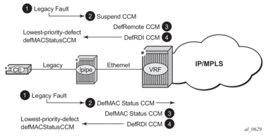 An example of the legacy fault propagation to the associated Ethernet SAP and the remote peer using the ETH-CFM fault propagation, assuming no Ethernet Fault is taking precedence.