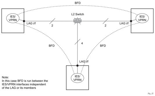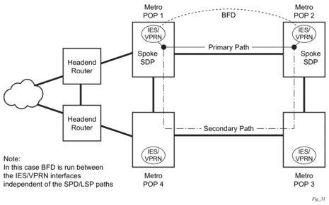 One application for a central BFD implementation is so BFD can be supported over spoke SDPs used to inter-connect IES or VPRN interfaces. When there are spoke SDPs for inter-connections over an MPLS network between two routers, BFD is used to speed up failure detections between nodes so re-convergence of unicast and multicast routing information can begin as quickly as possible.