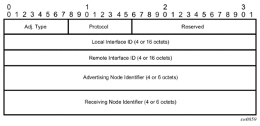 An SR-TE LSP, as a hierarchical LSP, uses the Target FEC Stack TLV, which contains a FEC element for each node SID and for each adjacency SID in the path of the SR-TE LSP. Because the SR-TE LSP does not instantiate state in the LSR other than the ingress LSR, MPLS OAM is just testing a hierarchy of node SID and adjacency SID segments towards the destination of the SR-TE LSP. The format of the node-SID is as illustrated above. Figure 28 illustrates the format for the IGP-Adjacency segment ID is as follows: