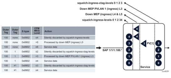 The squelch-ingress-levels command configures an exact service delineation SAP and binding match at the ingress followed immediately by Ethernet type 0x8902. This configuration silently discards the appropriate ETH-CFM packets according to the configured levels of the command, regardless of the presence of an ingress ETH-CFM management point, MEP or MIP. This squelch function occurs prior to other ETH-CFM packet processing functions.