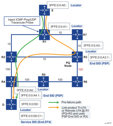 The primary path to D is through R2 and R4. The link-protect TI-LFA backup path is through R3 as a PQ node and then R2 and R4.