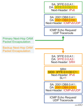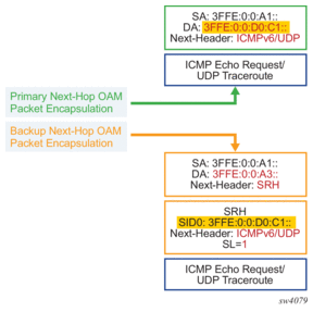 SR OS enhances lsp-ping and lsp-trace of a BGP IPv4 LSP resolved over an SR-ISIS IPv4 tunnel, an SR-OSPF IPv4 tunnel, or an SR-TE IPv4 LSP. The SR OS enhancement reports the full set of ECMP next-hops for the transport tunnel at both ingress PE and at the ABR or ASBR. The list of downstream next-hops is reported in the DSMAP or DDMAP TLV.