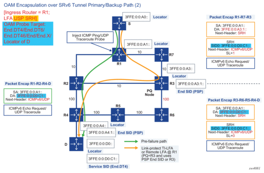 As shown in Figure 35, the network administrator originates a ping or a traceroute probe on node R1 to test the path of an SRv6 locator of node D, an SRv6 segment identifier (SID) owned by node D, or an IP prefix resolved to an SRv6 tunnel towards node D. R1 is referred to as the sender node. Node D is referred to as the target node because it owns the target locator or SID that is being tested. A target node can be any router in the SRv6 network domain which either owns the target locator or SID, or a router in which the OAM probe was extracted due to matching a local route or due to the value of the hop-limit field setting in the packet.