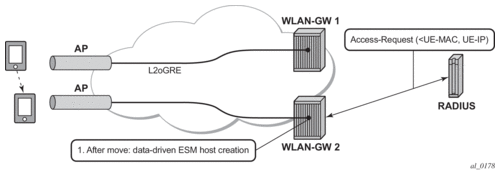For 802.1x/EAP based SSIDs, by default the AP requires re-authentication to learn the new session keys (PMK). 7750 SR as WLAN-GW RADIUS proxy infers mobility from the re-authentication, and updates the ESM host to point to the new AP. The new AP’s IP address is derived from the RADIUS attribute NAS-IP-address. The re-authentication also provides the new session keys to the AP in access-accept RADIUS response. In case the WIFI AP or ACs are capable of PMK key caching or standard 802.11r (or OKC, the opportunistic key caching pre-802.11r), the re-authentication on re-association can be avoided. In this case the UE can continue to send data, and the WLAN-GW can provide fast data-triggered mobility as defined in context of open SSIDs.