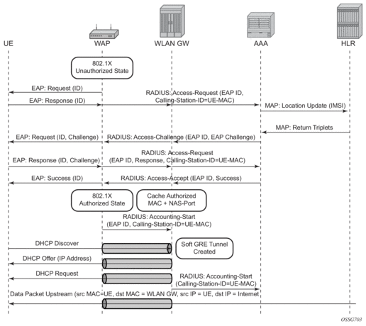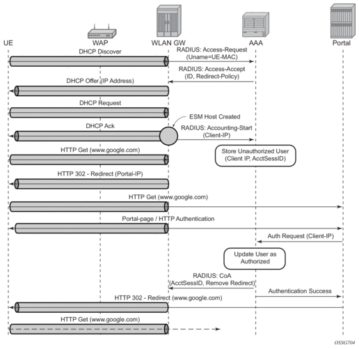For ESM support authenticate-on-dhcp must be enabled under configure service ies | vprn service-id subscriber-interface ip-int-name group-interface ip-int-name wlan-gw vlan-tag-ranges range start start end end. When receiving DHCPv4 the ISA sends the DHCP message and the cached access-accept to the CPM which further processes the setup sequence. On the CPM a regular RADIUS authentication policy should be picked up for the UE either through configuration on the group interface or via the LUDB. Typically this policy reflects the ISA-policy. This policy is used as a context to store the access-accept on the CPM for 10s.