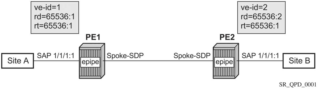 To configure a distributed Epipe service, you must configure service entities on the originating and far-end nodes. You should use the same service ID on both ends (for example, Epipe 5500 on ALA-1 and Epipe 5500 on ALA-2). The spoke-sdp sdp-id:vc-id must match on both sides. A distributed Epipe consists of two SAPs on different nodes.