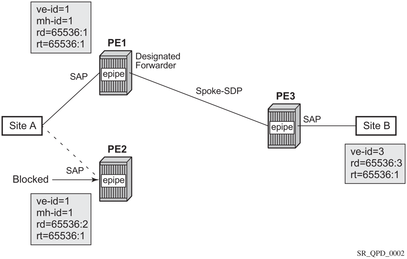 Figure 54 shows an example topology for a dual-homed BGP VPWS service used to create a virtual lease-line across an MPLS network between two sites: A and B. A single pseudowire is established between the designated forwarder of the dual-homed PEs and the remote PE.