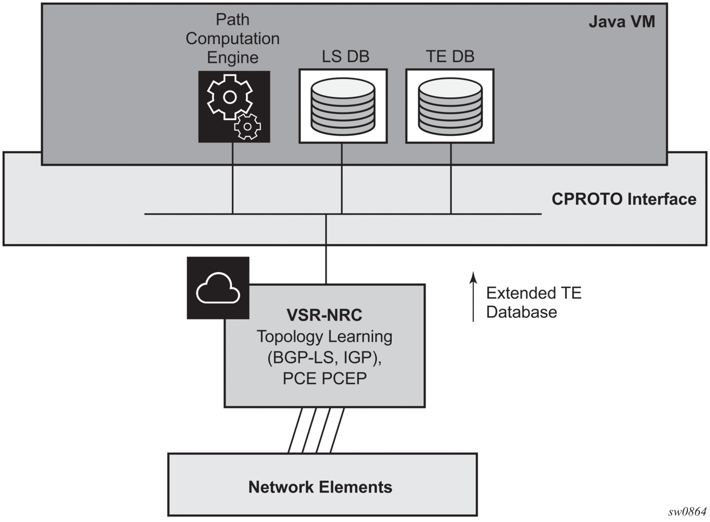 a single VM running a vSROS image handles the functions of topology discovery of multiple IGP instances and areas via IGP or BGP-LS and the PCE PCEP functions