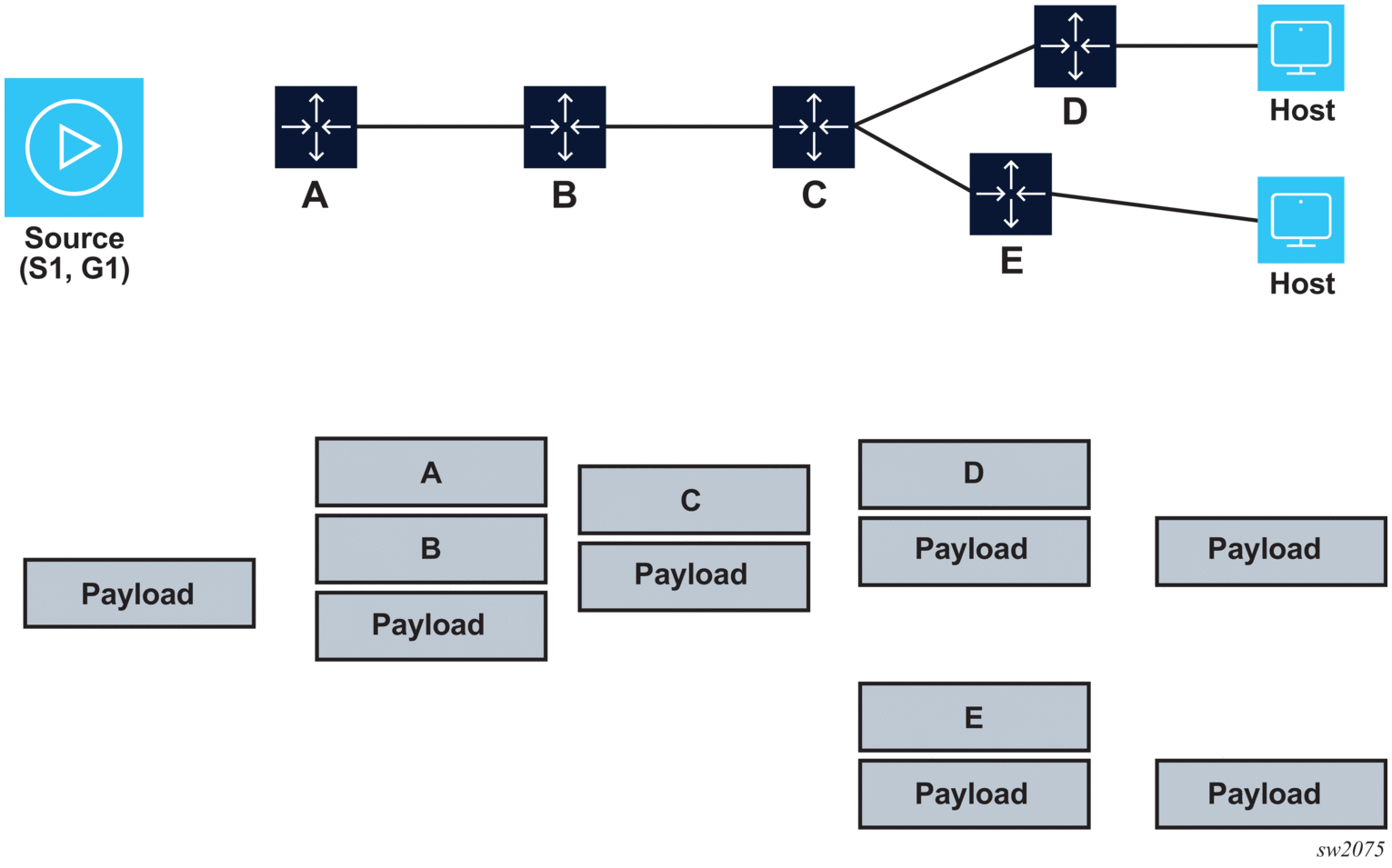 In Figure 29, nodes A, C, D, and E are replication-segment capable and B is unicast SR capable (that is, B is not replication-segment capable).