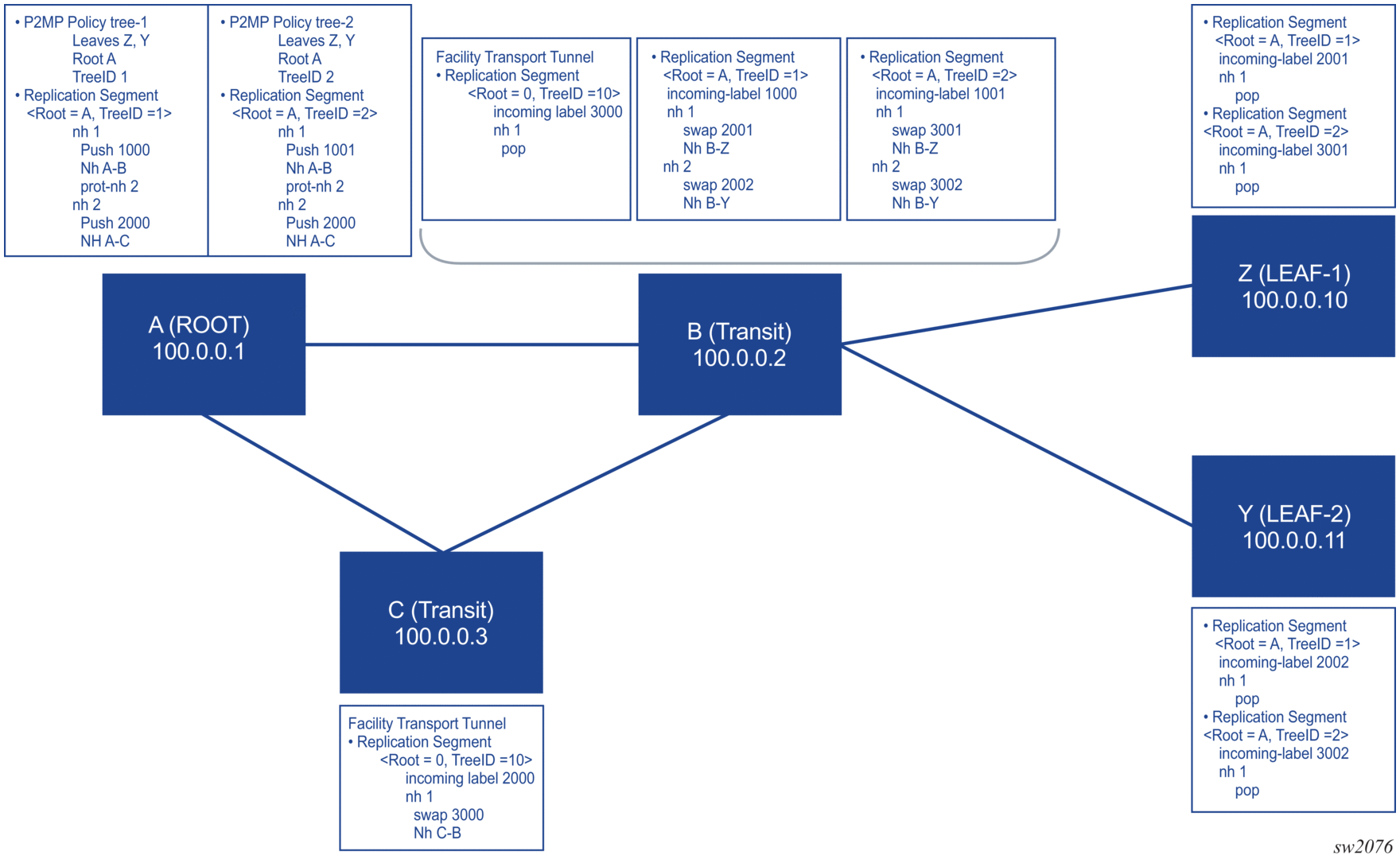 On each node, each replication segment represents a unique P2MP LSP with the following key: <tree ID, root ID, instance ID>. The instance ID and tree ID are unique to each root.