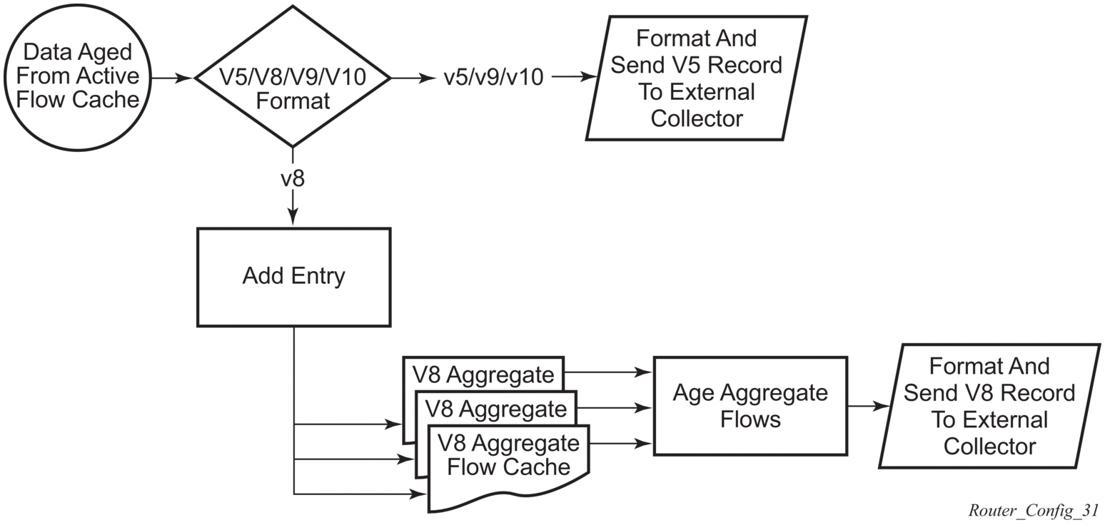 Version 8 is an aggregated export format. As individual flows are aged out of the raw flow cache, the data is added to the aggregate flow cache for each configured aggregate type. Each of these aggregate flows are also aged in a manner similar to the method the active flow cache entries are aged. When an aggregate flow is aged out, it is sent to the external collector in the V8 record format.