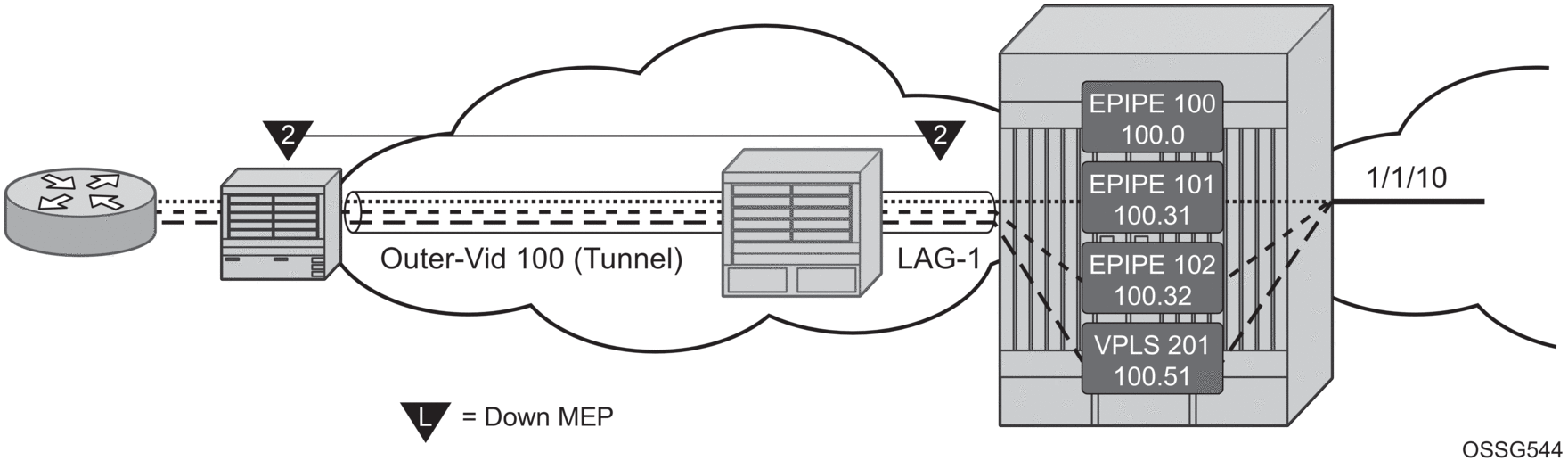 Only one of the MEPs on the MC-LAG nodes is active for VPLS service 100. The other MEP is in a shutdown mode, so that even when the MC-LAG is in standby and the port state is Link Up, the MEP is in a pseudo shutdown state.