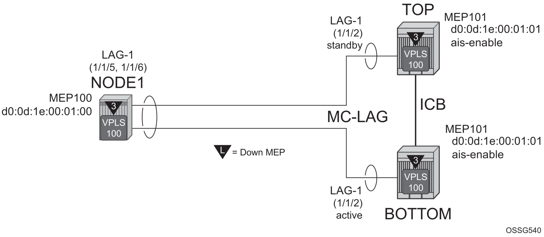 The following illustration, shows how MEPS can be linked to MC-LAG state. In this example, a service MEP is created on the LAG SAP on NODE1 within service VPLS 100. The MEPs configured on the MC-LAG nodes within service 100 are both configured the same. Both MEPs use the same MEP-ID, the same MAC address.