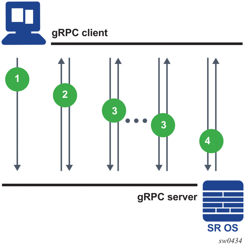 The gRPC transport service uses HTTP/2 bidirectional streaming between the gRPC client (the data collector) and the gRPC server (the SR OS device). A gRPC session is a single connection from the gRPC client to the gRPC server over the TCP/TLS port.